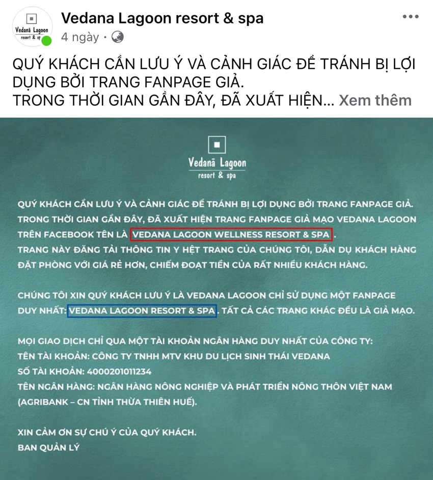 Mới đây, trang fanpage của Vedana Lagoon resort & spa (huyện Phú Lộc) đã phát đi thông báo, cảnh báo để lưu ý khách hàng cảnh giác tránh bị lợi dụng bởi trang fanpage giả. Cụ thể, trong thời gian gần đây, đã xuất hiện trang fanpage giả mạo Vedana Lagoon trên facebook với tên là Vedana Lagoon Wellness resort & spa đăng tải thông tin y hệt trang Vedana Lagoon resort & spa dẫn dụ khách hàng đặt phòng với giá rẻ hơn để chiếm đoạt tiền của khách hàng và đã có nhiều khách hàng mắc bẫy.