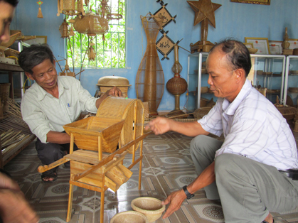 Nghệ nhân Võ Chức (trái) và nghệ nhân Thái Phi Hùng (phải) giới thiệu sản phẩm do hai ông sáng tạo đang được ưa chuộng tại trị trường trong nước và xuất khẩu