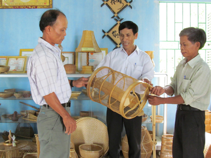 Nghệ nhân Thái Phi Hùng (bên trái ) và Võ Chức giới thiệu những sản phẩm mây tre độc đáo của làng nghề Bao La do hai ông thiết kế