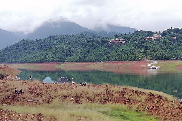 Không gian bao la, tĩnh mịch giúp tạo cảm giác thanh bình, an yên khi bạn đặt chân đến nơi này. Thi thoảng gà rừng xuất hiện, chúng xáo xác tìm nhau, rộn ràng đạp chân lên những chiếc lá khô trong um tùm cây cối. Vào mùa khô, hồ cạn phơi mình trong nắng, lộ ra những bãi đá sắc màu rực rỡ. Vì thế, đến mùa hè, nhiều bạn trẻ tìm đến Thiền viện Trúc Lâm Bạch Mã để check – in, tổ chức cắm trại bên bờ hồ. Đâu cần chi nhiều nhặn, một túp lều bạt, bóng đèn, bật lửa, tất cả đủ để tạo không gian huyễn hoặc, mênh mông bên dãy Bạch Mã ăm ắp hơi sương.