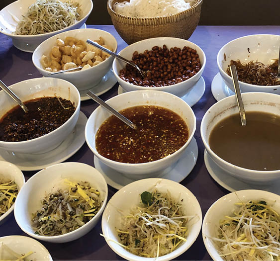 Ở Làng Hành Hương thì có buffet sáng cho những ngày cuối tuần. Ngoài những món Huế được yêu thích như bún bò, các loại bánh bèo nậm lọc…, tôi khá ấn tượng với cơm hến. Ngoài sạch sẽ, đẹp mắt, lại được nhân viên nêm nếm rất vừa miệng. Rau thì “bao la”, ai thích nhiều rau, nhiều ớt, nhiều tóp mỡ… đều được phục vụ nhiệt tình. Đến khu du lịch hạng sang mà ăn cơm hến nghe có vẻ kỳ kỳ, nhưng quả thật nếu đến đây mà bạn chưa thử qua món cơm hến thì thiếu sót lắm, nhất là những “tín đồ” cơm hến như tôi, ít ra cũng phải hai tô mới “đằm bụng”.