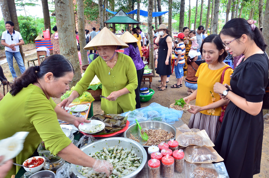Từ sáng sớm, đông đảo người dân và du khách thập phương đến tham quan trải nghiệm các hoạt động của phiên chợ, như thưởng thức các món ăn dân dã, bình dị do chính người dân trong làng làm ra: bún, bánh cuốn, bánh đúc, bánh canh, bánh quai vạc, bánh phu thê, bánh gạo…