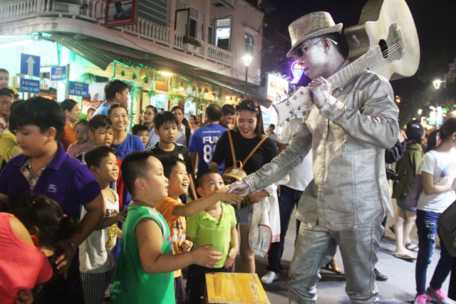 Ở một vài góc khác, nghệ thuật đường phố vẫn luôn thu hút khách. Các thùng tiền “tùy tâm” để du khách ủng hộ cho các nghệ sĩ được đặt ở một góc nhỏ, rất tế nhị và cũng rất lịch sự. Gần như khách tỏ ra hài lòng. Ai thích thì ủng hộ! Người biểu diễn luôn nhiệt tình vì khán giả.