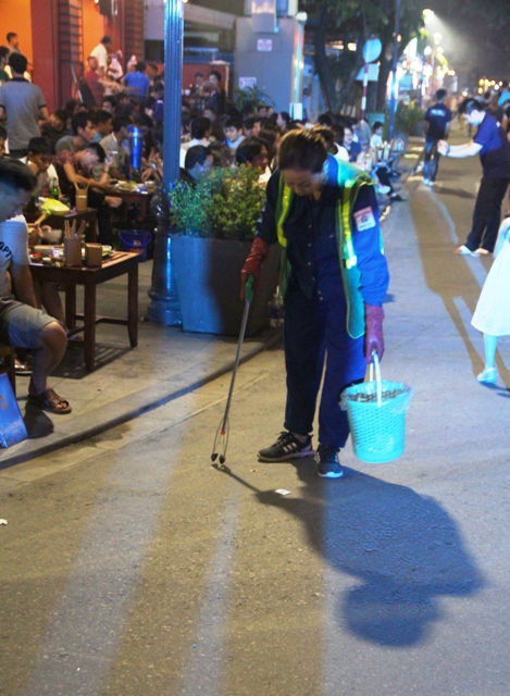 Bên cạnh những hình ảnh vui chơi, đâu đó vẫn có những cô lao công âm thầm thu gom từng mẫu rác để phố đi bộ trở nên đẹp hơn