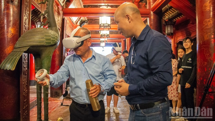 | Khách du lịch thích thú khi được trải nghiệm hệ thống thực tế ảo tại di tích Văn Miếu-Quốc Tử Giám. (Ảnh: HÀ NAM) |