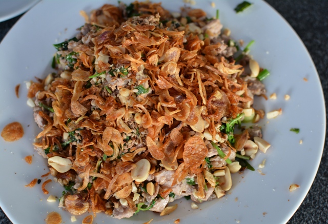 Đầu tiên phải kể đến món khai vị vả trộn. Vả là một loại quả đặc trưng ở Huế, thường mọc thành chùm trên những cành già hoặc ở gốc thân. Quả vả là một vị thuốc đông y có nhiều tác dụng cho sức khỏe, có vị ngòn ngọt, giòn giòn, lẫn chút chan chát ở đầu lưỡi.