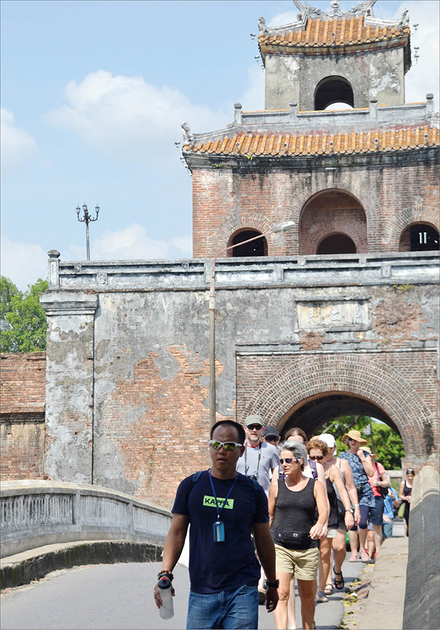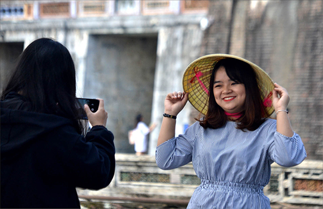 Du khách chụp hình lưu niệm trước lầu Ngũ Phụng, Đại Nội