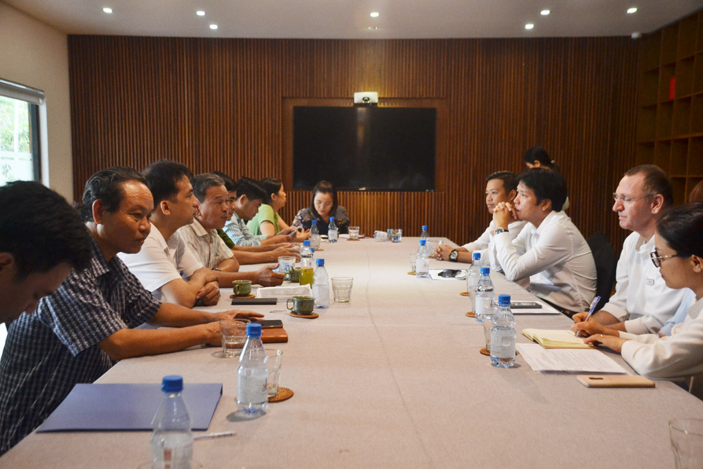 Đoàn kiểm tra liên ngành (bên trái) trao đổi về các điều kiện an toàn trong hoạt động đối với đại diện Alba Thanh Tân
