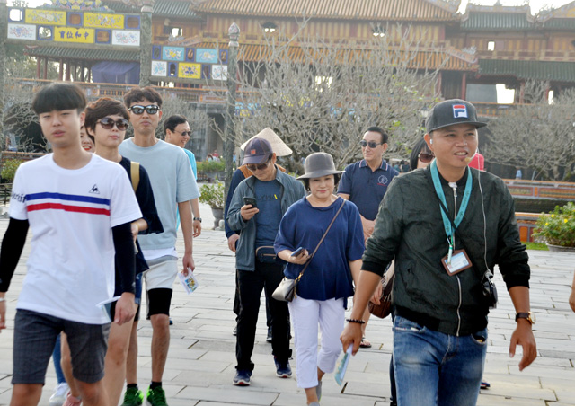 Du khách đến Huế trong năm 2018 đạt khoảng 4,3 triệu lượt, trong ảnh: Khách tham quan Đại Nội