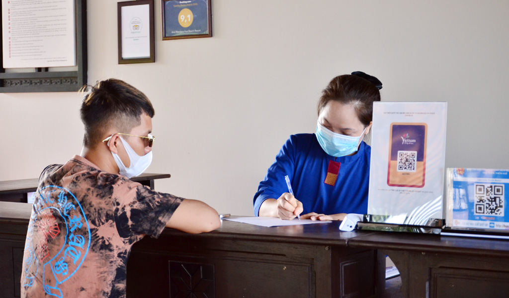 Du khách làm thủ tục nhận phòng tại Lapochine Beach Resort trong chiều 14/6