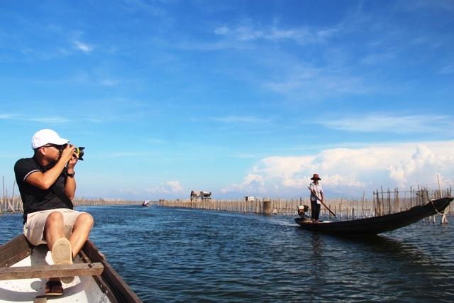 Một thành viên trong đoàn khảo sát du lịch tranh thủ chụp lại hình ảnh tuyệt đẹp trên đầm phá