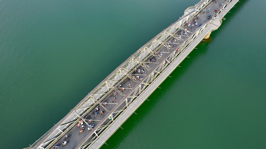Đoàn qua cầu Trường Tiền, cây cầu nổi tiếng của xứ Huế