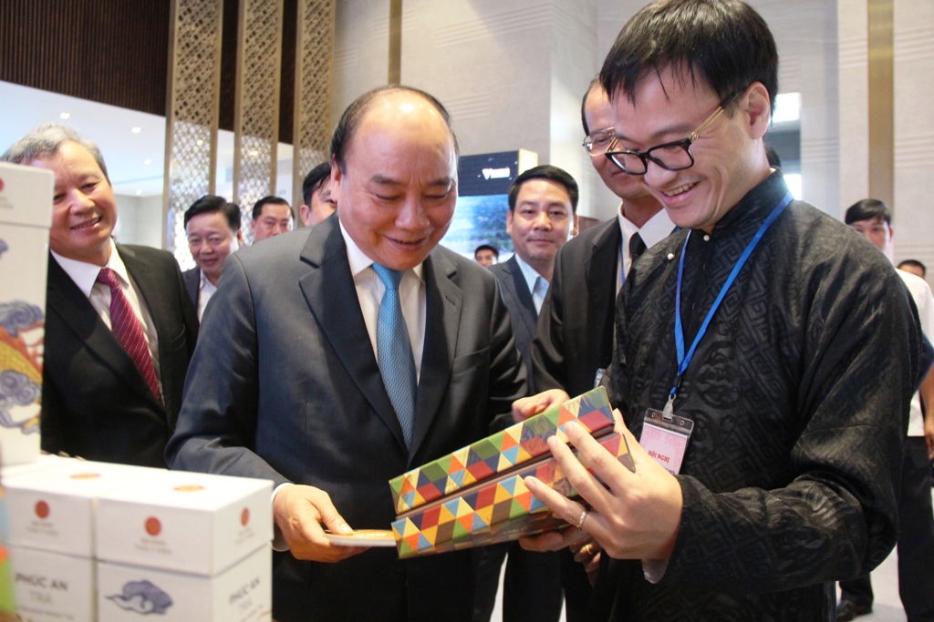 Thủ tướng Chính phủ Nguyễn Xuân Phúc tham quan một gian hàng trưng bày sản phẩm bên lề hội nghị “Phát triển du lịch miền Trung và Tây Nguyên”