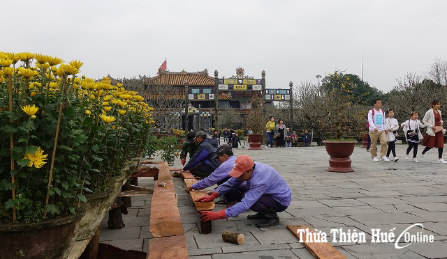 Những ngày gần cuối tháng Chạp cũng là khoảng thời gian lực lượng Phòng Cảnh quan môi trường của Trung tâm BTDTCĐ Huế tập trung cao điểm cho công tác trưng bày hoa và cây cảnh tại các điểm di tích. Hàng trăm chậu cây cảnh quý các loại và hàng ngàn chậu hoa đủ sắc màu được phân bổ trang trí trong Hoàng cung Huế và các điểm lăng, tẩm, tạo thêm hương sắc và không gian đón xuân mới trong không gian thành quách phong rêu, cổ kính.