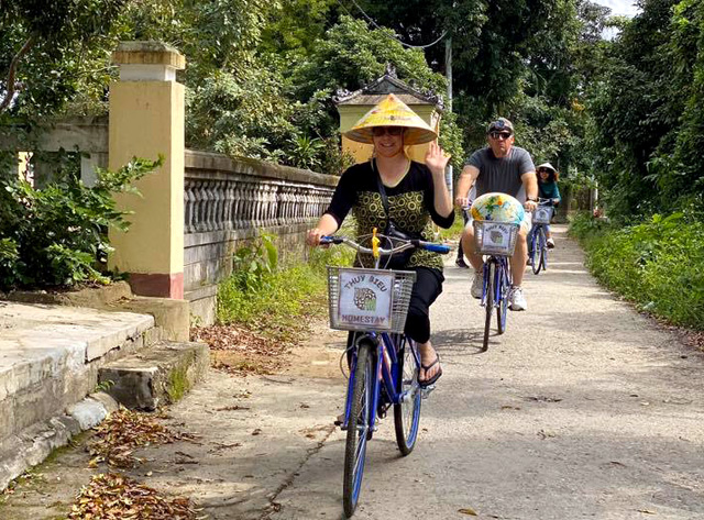 Đoàn khảo sát thích thú khi được đạp xe qua các con đường quê yên bình ở Huế