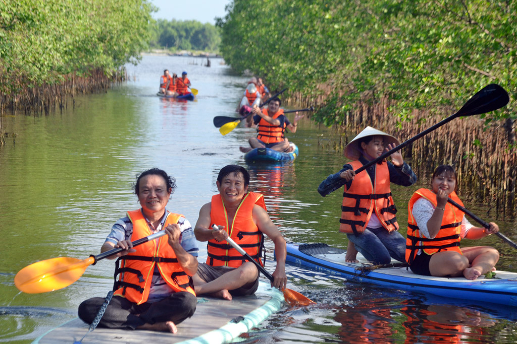 Du khách tham gia trải nghiệm chèo thuyền sup trên phá Tam Giang