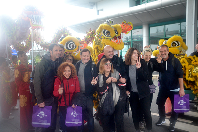 Du khách thích thú với múa Sân sư rồng trong buổi đón khách đến Huế bằng đường hàng không