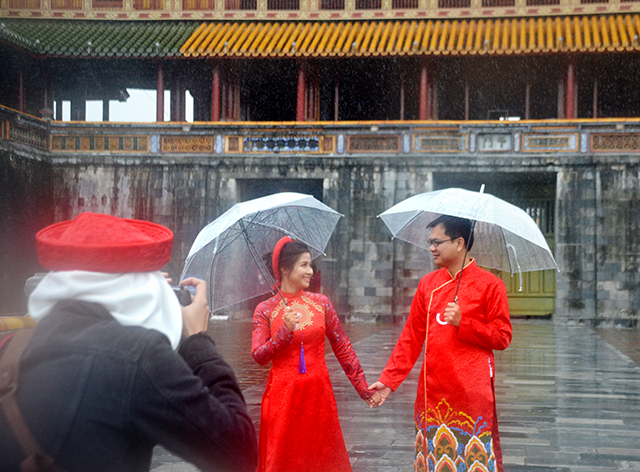 Dù trời mưa, đôi bạn trẻ vẫn chụp ảnh lưu giữ kỷ niệm trước Đại Nội