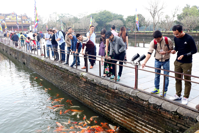 Du khách cho đàn cá ăn trong Đại Nội