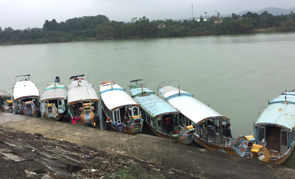 Thuyền rồng đậu đưa đón khách ở trước bến đường lên chùa trên đường Nguyễn Phúc Nguyên