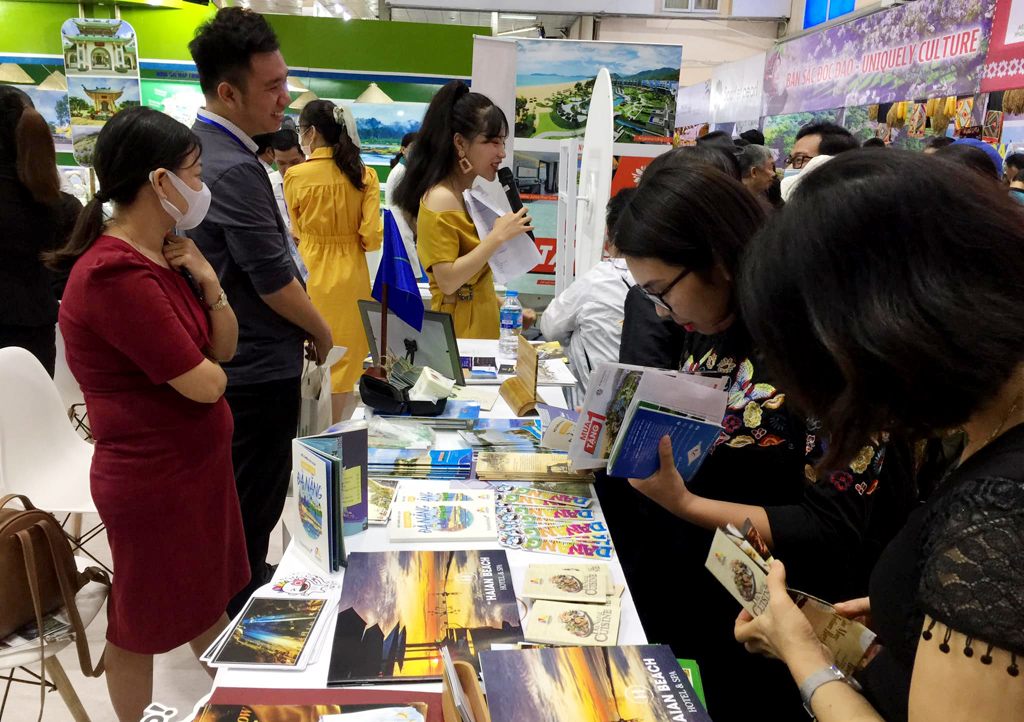 Các đối tác tìm hiểu chương trình kích cầu tại gian hàng chung của 4 địa phương Quảng Nam - Đà Nẵng - Thừa Thiên Huế - Quảng Bình. Ảnh: Anh Tuấn