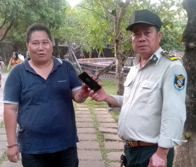 Lực lượng bảo vệ Trung tâm Bảo tồn Di tích Cố đô Huế trao trả điện thoại cho du khách đánh rơi khi đi tham quan