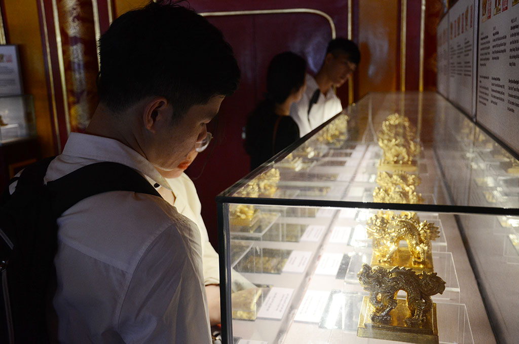 Du khách tìm hiểu lịch sử các kim ấn được trưng bày ở lầu Ngũ Phụng (Đại Nội)