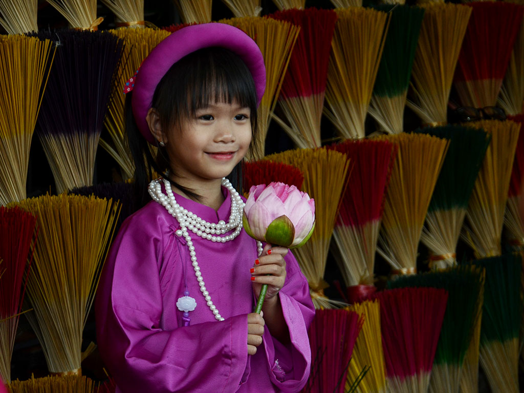 Một du khách nhí ở Hà Nội lưu lại kỷ niệm bằng bộ cổ phục màu "tím Huế"