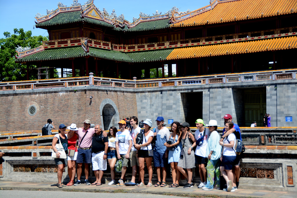 Du khách vui vẻ chụp hình lưu niệm khi đến tham quan Huế
