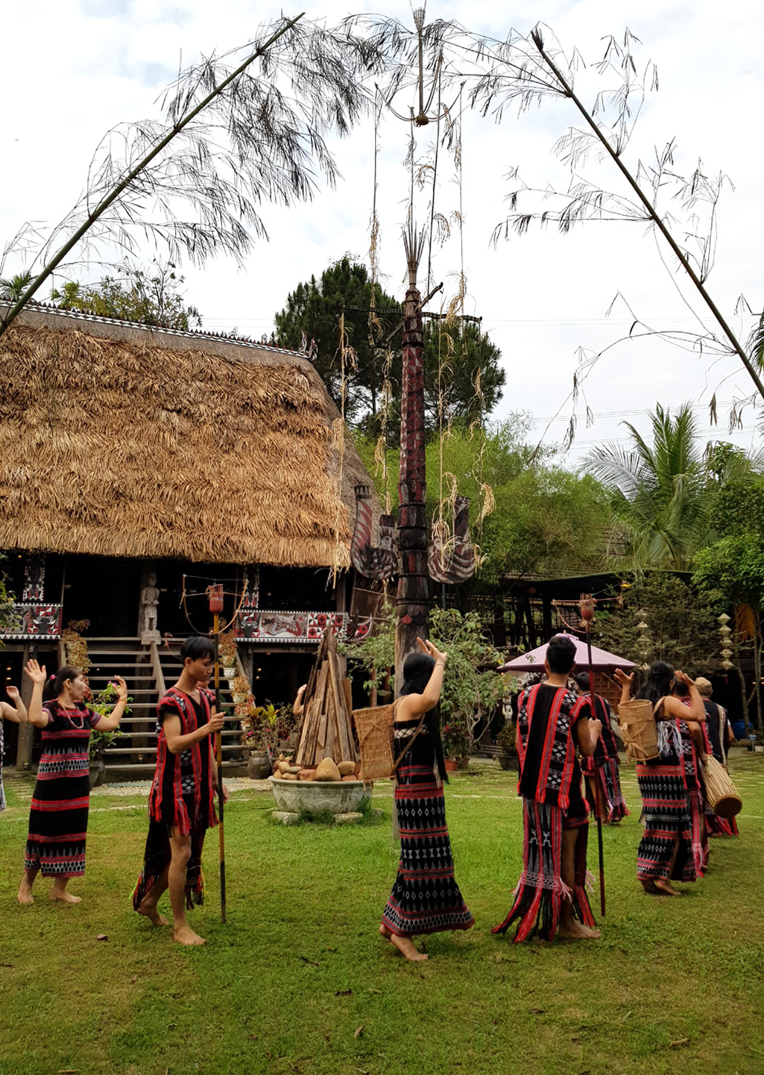 Các nghệ nhân người Cơ tu được mời về thao diễn dệt zèng, biểu diễn cồng chiêng... tại nhà Gươl truyền thống