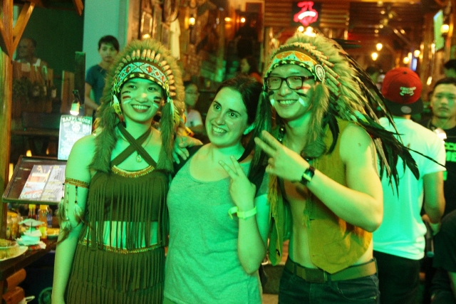 Du khách nước ngoài thích thú chụp hình với bạn trẻ Huế hóa thân thành những nhân vật sôi động trên phố đi bộ