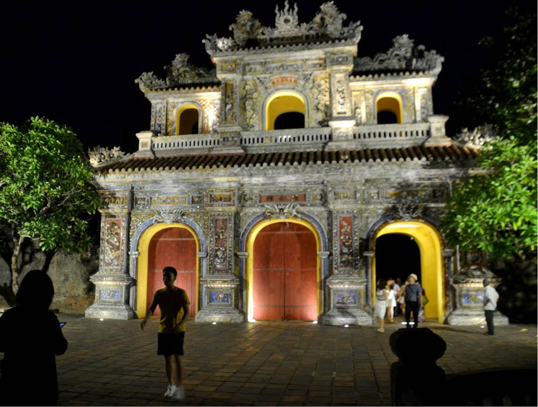Cửa Hiển Nhơn được sáng đèn vào ban đêm, nhưng xung quanh lại rất tối