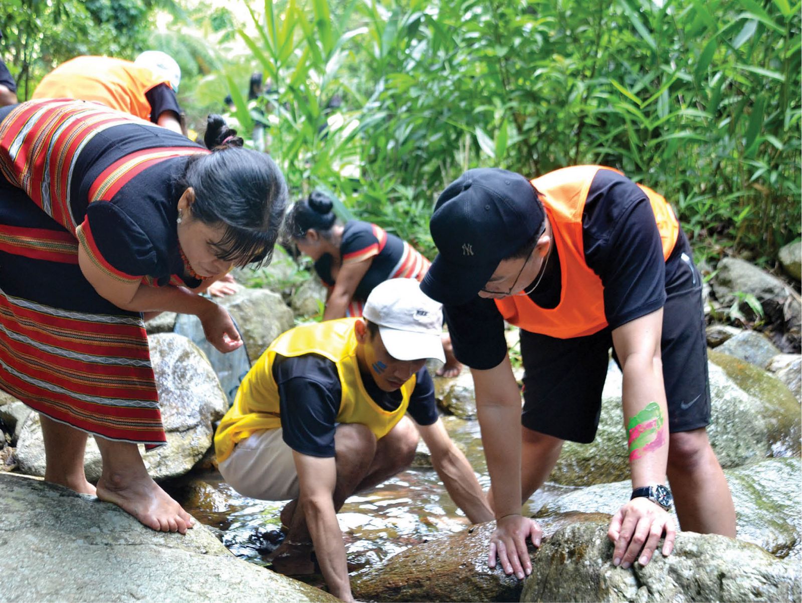 Du khách trải nghiệm bắt cá suối tại thác A Nôr dưới sự hướng dẫn của người dân