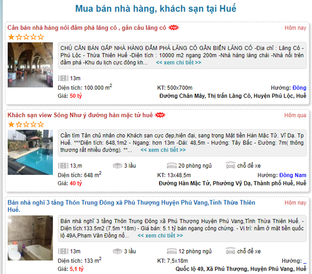 Tìm kiếm mục bán nhà hàng, khách sạn ở trên trang alonhadat.com.vn (trang mua bán bất động sản nổi tiếng nhất hiện nay), không chỉ có khách sạn mà nhiều nhà hàng chuyên phục vụ khách du lịch cũng đang rao bán. Điển hình nhất có thể kể đến Nhà hàng Làng Chài (đầm Lập An, thị trấn Lăng Cô) đang đăng thông tin bán nhà hàng với giá 50 tỷ đồng.