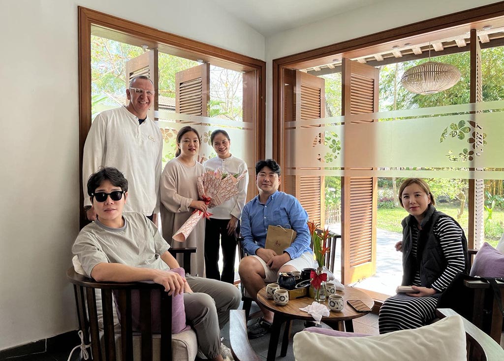 Đại diện Khu nghỉ dưỡng Alba Thanh Tân chào mừng đoàn khách quốc tế đầu tiên đến nghỉ dưỡng trong năm mới