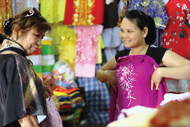 Du khách chọn mua áo dài tại chợ Đông Ba, TP. Huế