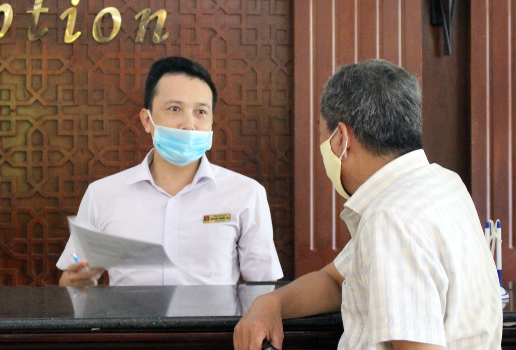 Lễ tân một khách sạn thông tin khách lưu trú đến lãnh đạo Sở Du lịch trong chuyến kiểm tra ngày 25/8