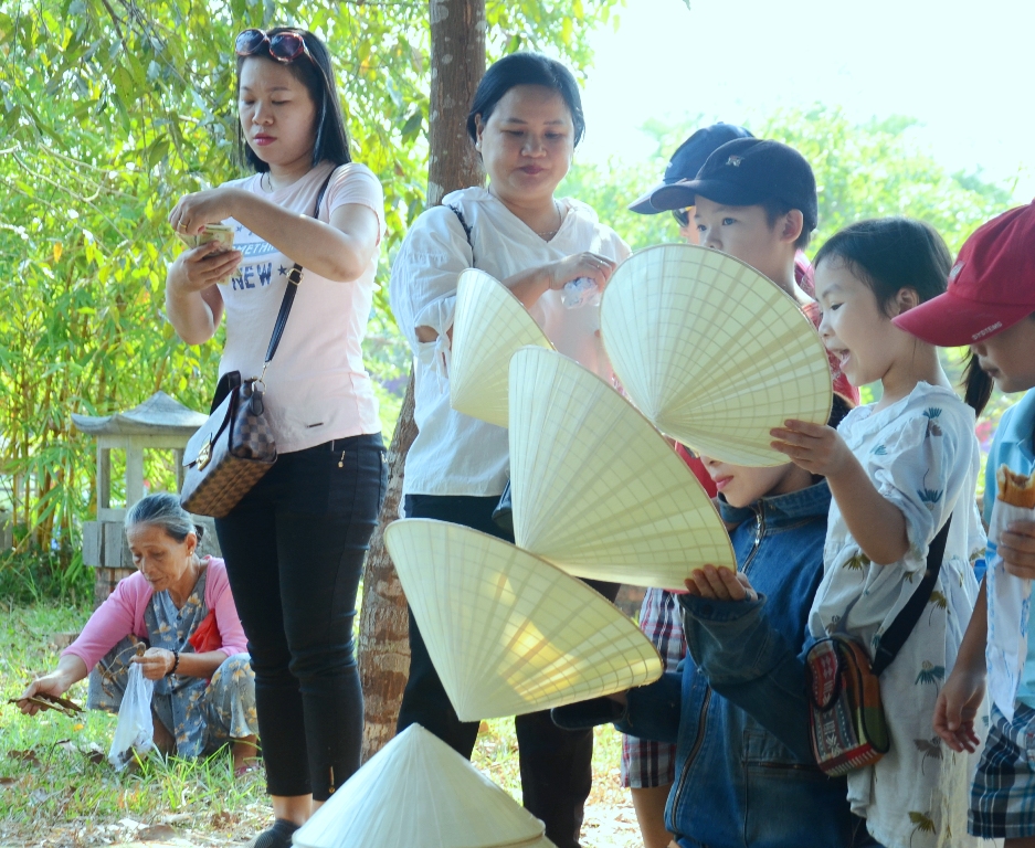 Chăm chú xem nón lá do người dân Thủy Thanh chằm