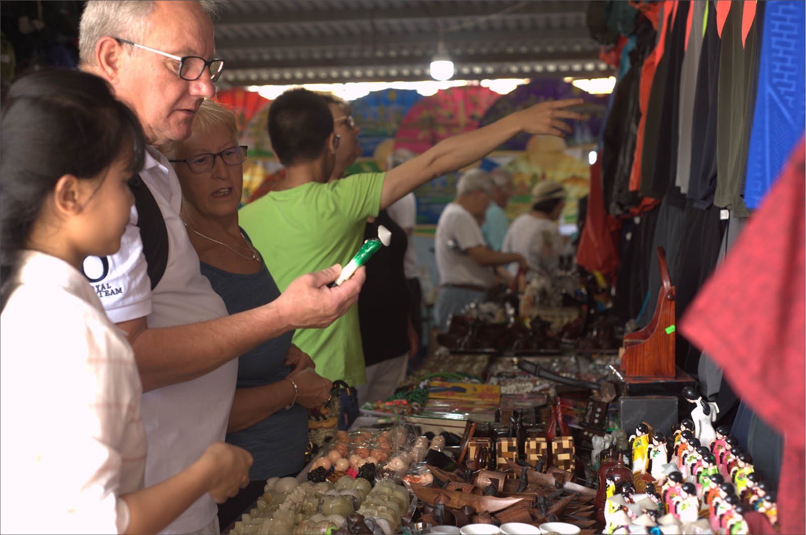Khách du lịch mua hàng lưu niệm khi dừng chân tại cảng Chân Mây. Ảnh M.Lê