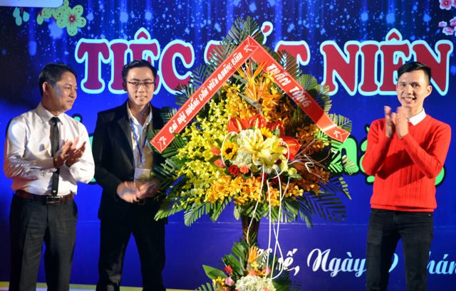 Khách mới (bên phải) tặng hoa cho đại diện Chi hội HDV