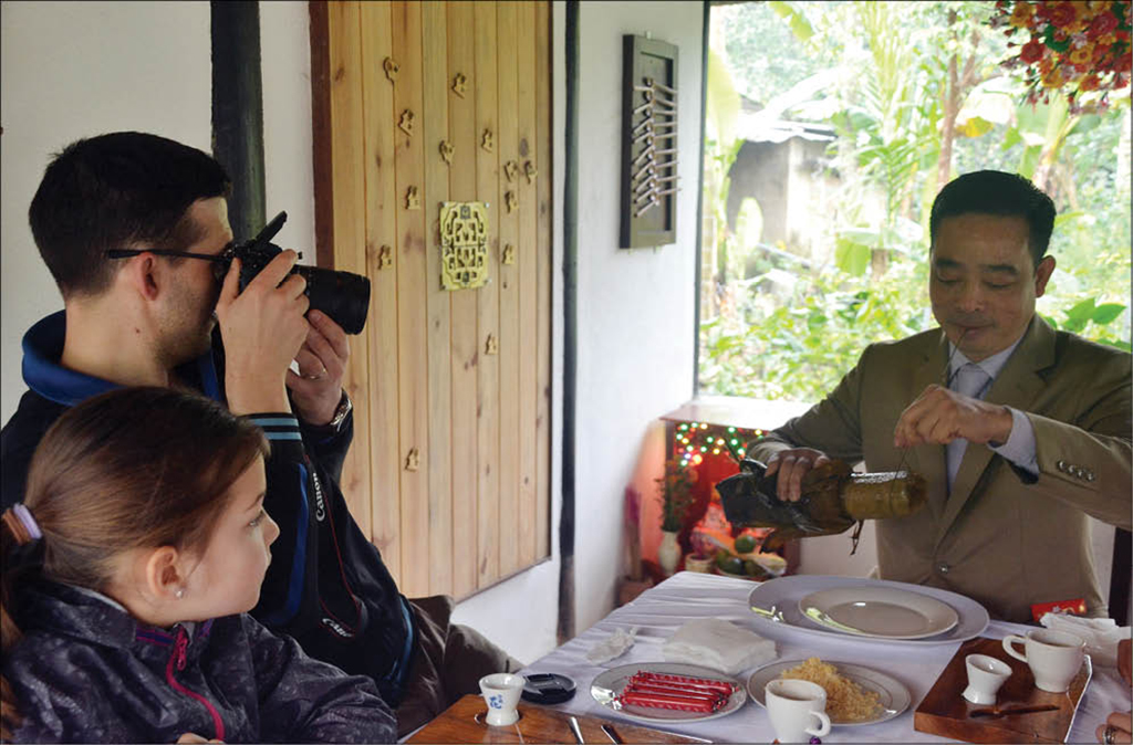 Dịp Tết Nguyên đán, đúng hẹn, sáng mùng 1 tết, tôi có mặt ở homestay Nguyệt Biều (Thủy Biều, TP. Huế) để ghi nhận không khí đón tết của một gia đình người Anh đến Huế du lịch. Trên bàn ăn sáng, ngoài những món ăn hợp khẩu vị của người phương Tây, nhiều món ăn gắn với ngày tết cổ truyền, đặc biệt là hai món bánh chưng và bánh tét cũng được những người tổ chức tour hào soạn để đãi khách. Ngồi vào bàn ăn, những du khách vô cùng ngạc nhiên khi gia chủ mở bánh tét và dùng sợi lạt cột bánh để cắt từng lát bánh mỏng mà vẫn tròn đều. Gia chủ không quên giới thiệu cách chế biến hai loại bánh truyền thống luôn có trong ngày tết của người Việt Nam nói chung và Huế nói riêng.
