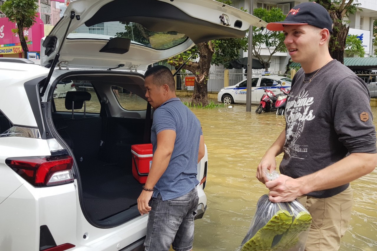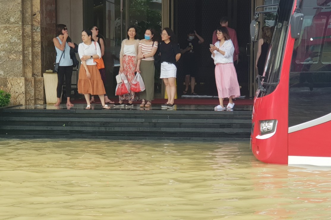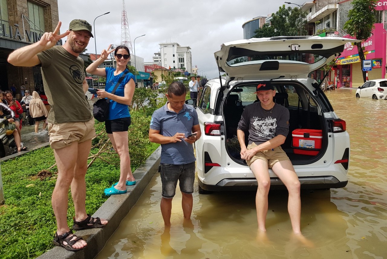Sau một hành trình lội lụt, nhóm du khách nước ngoài được ô tô đón tại đường Hà Nội