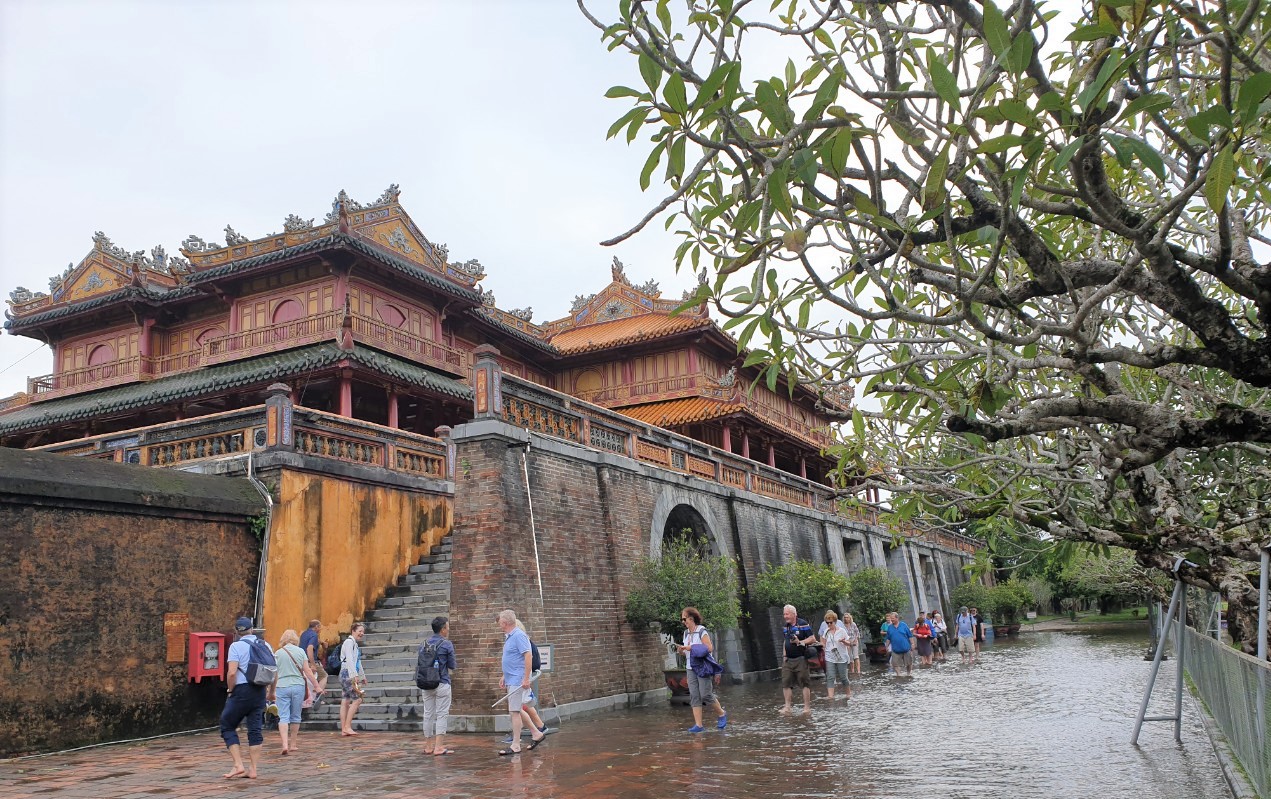Đoàn du khách trải nghiệm Đại nội Huế trong những ngày mưa, lũ