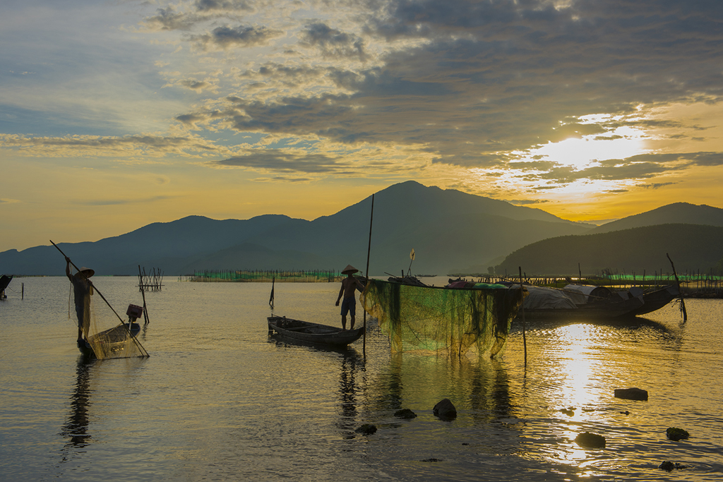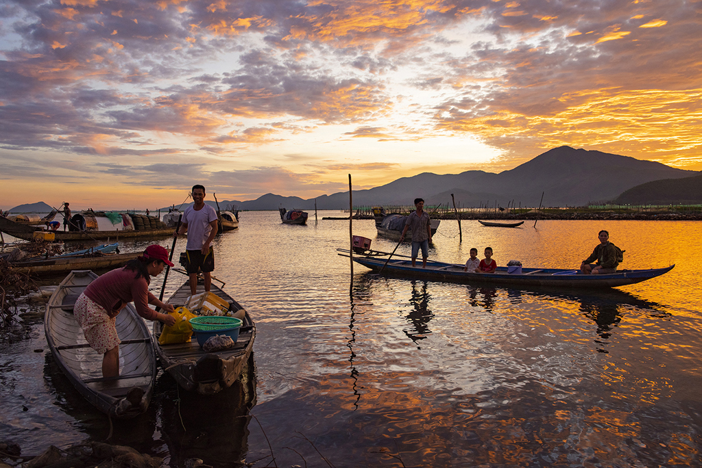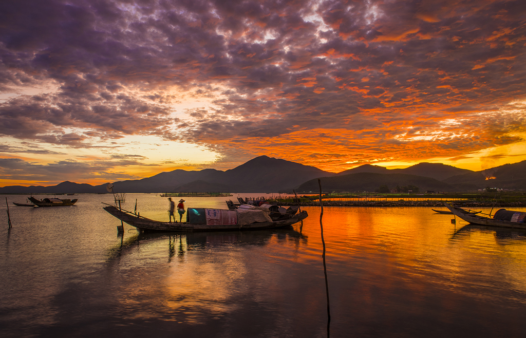Đặt chân tới đầm Cầu Hai lúc trời còn tờ mờ sáng, dựng chân máy ảnh xong cũng là lúc mặt trời bắt đầu lên. Thật sự mãn nhãn với vẻ đẹp hùng vĩ nơi đây, phong cảnh, màu sắc rực rỡ mà chỉ có mặt tại lúc này mới cảm nhận hết được. Những chiếc thuyền, ghe xuôi ngược chuẩn bị cập bến. Tiếng cười, tiếng í ới gọi nhau hứa hẹn một ngày bội thu.