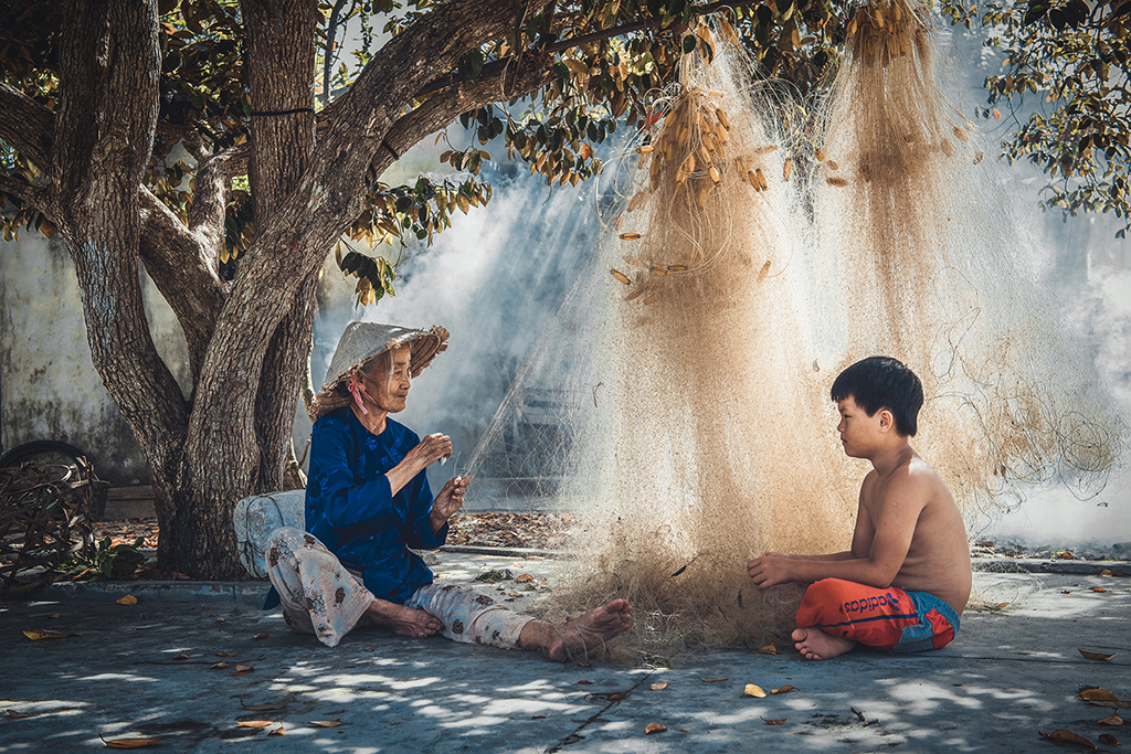 Trên bờ, bà cháu cùng vá lưới