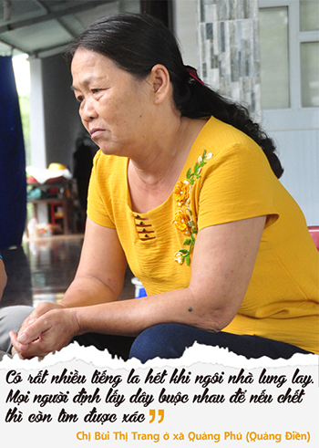 Thoát chết trong gang tấc, chị Bùi Thị Trang ở xã Quảng Phú (huyện Quảng Điền) đã trải qua nỗi sợ hãi ấy. Thấy nước dâng cao, 60 người dân sơ tán đến trụ sở UBND xã. Hai giờ sáng, nước ập vào. “Có rất nhiều tiếng la hét khi trụ sở lung lay. Mọi người định lấy dây buộc nhau để nếu chết thì còn tìm được xác”, chị Trang cho hay.