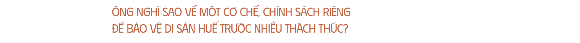 Khi nói đến một cơ chế, chính sách riêng cho Huế, tôi cho rằng đây không chỉ là mong muốn, mà là yêu cầu tất yếu nếu chúng ta thực sự coi Huế là “viên ngọc” của di sản Việt Nam và là một trong những trung tâm di sản quan trọng của thế giới. Huế đang mang trên vai một khối lượng di sản đặc biệt lớn, trải rộng, đa tầng, đa lớp, lại nằm trong vùng thường xuyên hứng chịu thiên tai. Nếu vẫn áp dụng cơ chế chung như các địa phương khác, thì rất khó để Huế bảo tồn di sản một cách chủ động, bền vững và tương xứng với giá trị của mình.