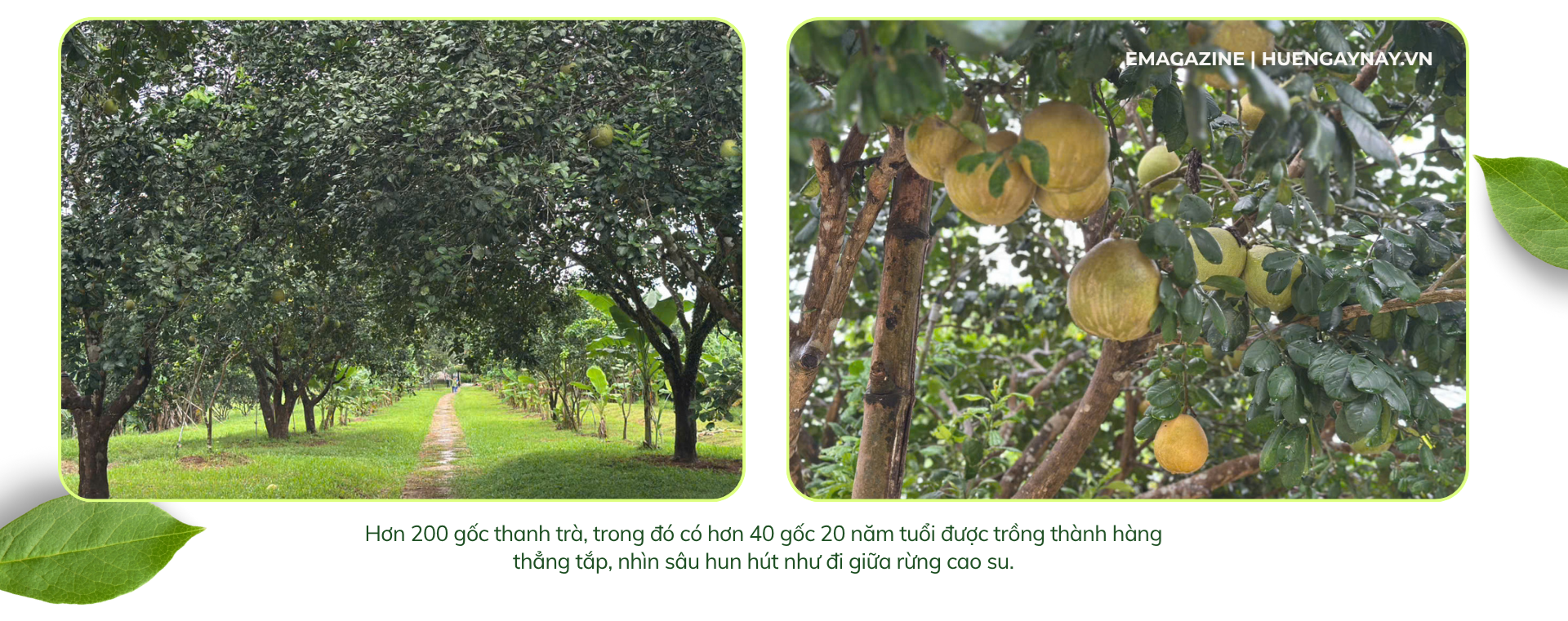 Vườn thanh tra chỉ chừng hơn 1 ha nhưng do chủ đất biết cách bố trí, sắp xếp nên nhìn rộng thênh thang. Hơn 200 gốc thanh trà, trong đó có hơn 40 gốc 20 năm tuổi được trồng thành hàng thẳng tắp, nhìn sâu hun hút khiến ta như đi giữa rừng cao su miền Đông Nam Bộ. Xen kẽ giữa thanh trà, từ năm 2021, ông Lịch trồng chuối sứ theo hình thức “lấy ngắn nuôi dài” từ hợp đồng kinh tế với Công ty cổ phần Quế Lâm (gọi tắt là Quế Lâm) và một số loại cây trồng khác như ổi, bưởi da xanh hay rau màu.
