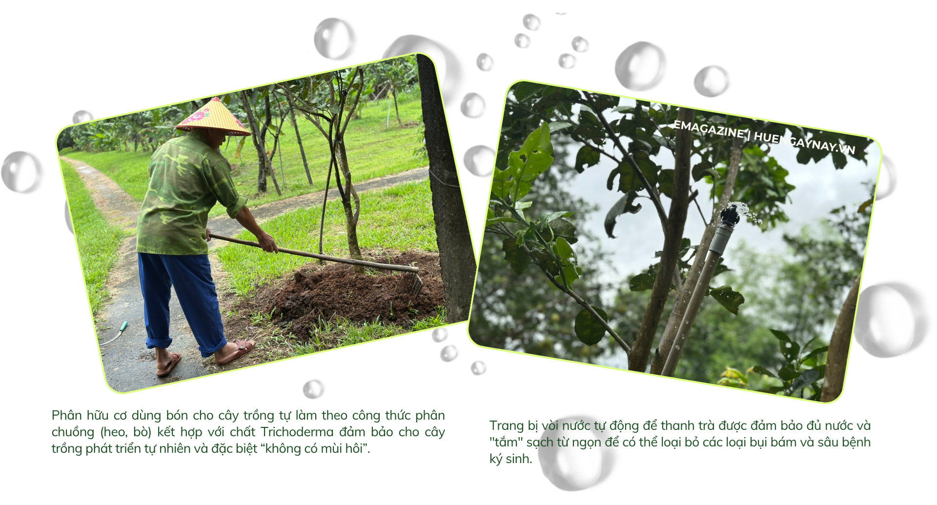 Chúng tôi quan sát thấy, mỗi gốc thanh tra đều có vòi nước tự động. Ông Lịch vui vẻ cho biết: Tận dụng nguồn nước sông Ô Lâu, năm 2022, đã đầu tư 60 triệu đồng làm hệ thống tưới này cho thanh trà. Chỉ cần bật công tắc nước là cả vườn thanh trà ngập chìm trong sương nước. Tưới nước kiểu này cũng là một cách tắm cho cây. Không chỉ được đảm bảo đầy đủ nước mà thanh trà còn được làm sạch từ ngọn để có thể loại bỏ các loại bụi bám và sâu bệnh ký sinh.