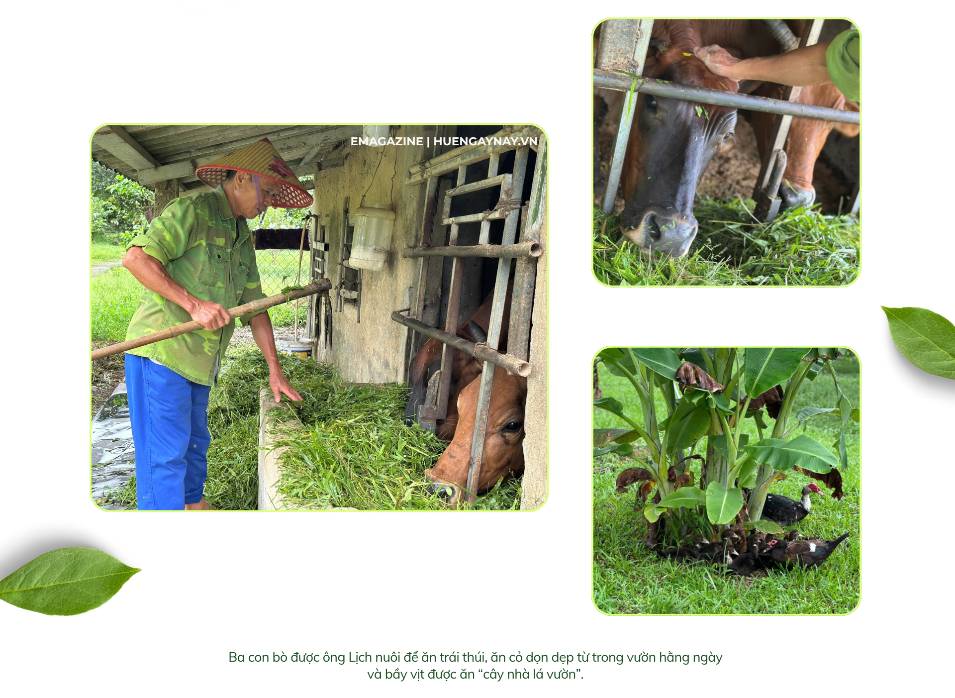 Ở một góc vườn, còn có chuồng bò. Ông Lịch bảo, nuôi bò là để ăn trái thanh trà thúi, ăn cỏ dọn dẹp từ trong vườn hằng ngày. Chuồng bò phủ trấu vừa đảm bảo ấm áp về mùa đông cho gia súc vừa để có nhiều phân bón. Và, cùng với chuồng trại heo F1, cách vườn thanh trà không xa, chuồng bò này đảm bảo nguồn phân hữu cơ cho cả một ha cây trồng để ông Lịch có thể “nói không” với phân bón vô cơ và đảm bảo quy trình tuần hoàn trồng trọt - chăn nuôi khép kín, “không bỏ thứ gì” theo ước muốn.